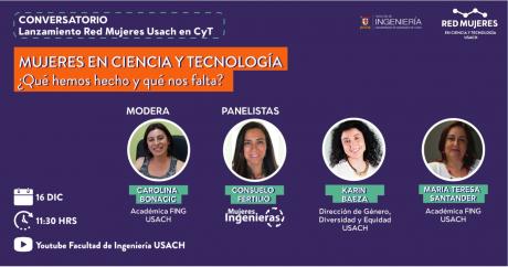 El próximo miércoles 16 de diciembre, a las 11:30 hrs, se realizará el lanzamiento oficial de esta iniciativa con un conversatorio llamado “Mujeres en Ciencia y Tecnología. ¿Qué hemos hecho y qué nos falta?, que será moderado por la Dra. Carolina Bonacic y en el que participará Consuelo Fertilio de Mujeres Ingenieras, Karin Baeza, Directora de la Dirección de Género, Diversidad y Equidad USACH y la Dra. María Teresa Santander, Académica FING USACH. Esta instancia se realizará a través del Canal de Youtube de la Facultad de Ingeniería USACH.